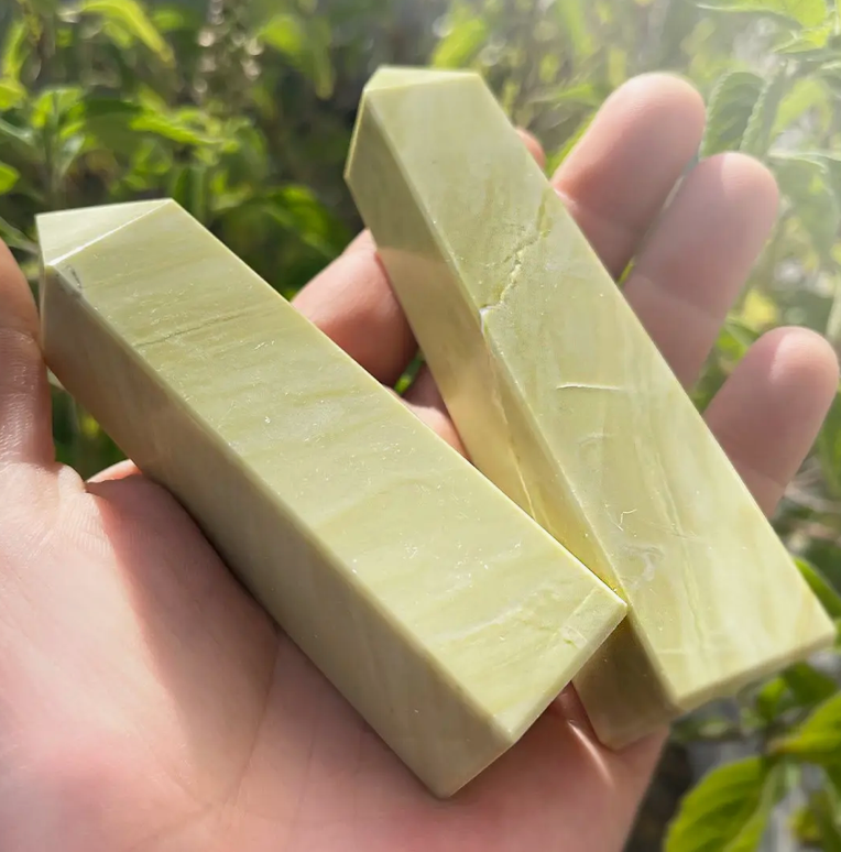 Indulge in this beautifully green serpentine tower. This mineral is carved to perfection and the blend of creamish-green hues makes it absolutely delectable. A healing piece that can be used during outdoor meditation, connect and reset with nature. A highly coveted mineral, serpentine will be your next favorite in your crystal collection.  These are wonderful for meditation. Add them to your sacred space for a boost in concentration, peace, and quieting of the mind for your meditation practice.  Generous-sized tower measuring over 4.5 inches tall. Handmade in Gujarat, India Sourced from known mines in India. Beautifully cut and polished Slight variations and very subtle imperfections naturally occur in each piece. Since each piece is mined from the earth and hand-polished, there are beautiful but slight variations from one piece to the next. These are not considered defects.